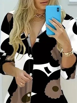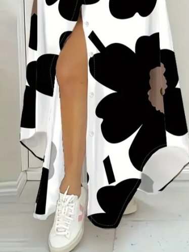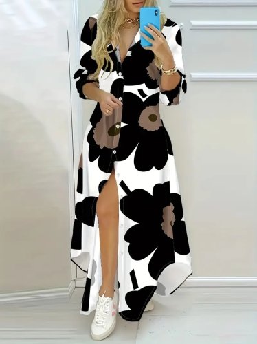 • Kadın yakalı önden düğmeli çiçek desenli uzun süprem elbise