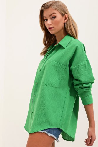 20153 Tek Cepli Oversize Keten Gömlek Yeşil