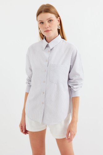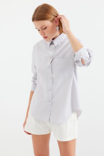 • 20212 Tek Cepli Çizgili Oversize Gömlek Bej
