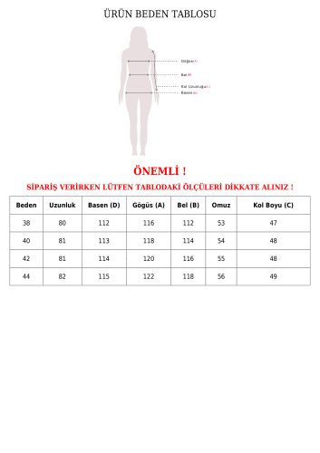 • Modelin Ölçüleri: Boy:165, Kilo:55, Göğüs:90, Bel:72, Kalça: 100