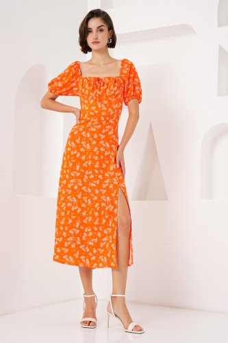 2387 Yırtmaç Detaylı Elbise Turuncu
