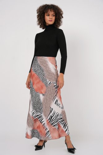 2512 Desenli Yırtmaçlı Elbise Siyah